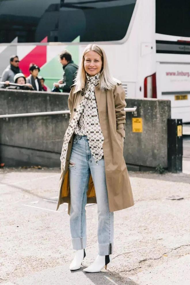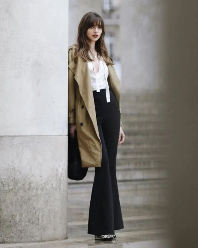特别是白色的飘带衬衫,跟卡其色风衣异常地搭调,组合在一起,就是简单有气质,优雅又精致的法式时髦女郎形象。