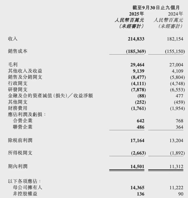 数据显示,今年前三季度,奇瑞汽车收入2148.33亿元,同比增长17.94%;期内利润145.01亿元,同比增长28.19%;归母净利润143.65亿元,同比增长28.01%;呈现营收增速高于销量增速、利润增速高于营收增速的良性循环态势。