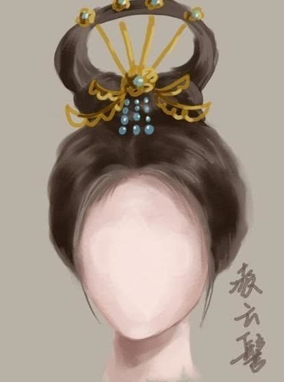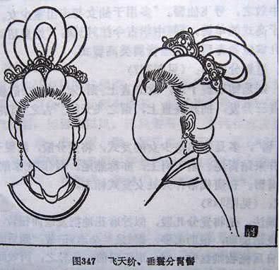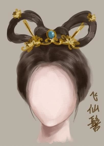 ★飞天纟介,垂鬟分肖髻★ 飞天纟介则是结三鬟于顶,耸立直上。据《宋五行志》记载:文帝元嘉六年,民间妇人结发者三分发,抽其鬟直上,谓之飞天。古之百花发式亦属这种类型。 垂鬟分肖髻,多是未出室少女的发式,将发分股,结鬟于顶,不用托拄,使其自然垂下,并束结肖尾、垂于肩上,亦称燕尾。据《国宪家猷》记载:汉明帝令宫人梳百花分肖髻。在唐代常作为处女发式标志。