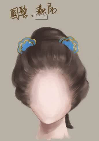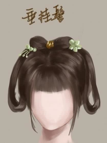 这种发式的编盘方法是:先将头发盘成一个十字行的发髻,再将余发在头的两侧各盘一鬟直垂至肩,上用簪、钗固定即可。