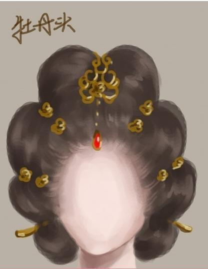 牡丹头是一种高髻,苏州盛行此式,后逐渐流行北方。《坚瓠集》:我苏(苏州)妇人梳头有牡丹、钵盂之名, 鬓有闹花、如意之号。尤侗诗:闻说江南高一尺,六宫争学牡丹头。有人说其重者几至不能举首,形容其式高大,实际高约七寸左右,鬓蓬松而髻光润,髻后施双绺发尾。这种髻当系假发衬垫,加以黏汁光润之。明代妇女发式。