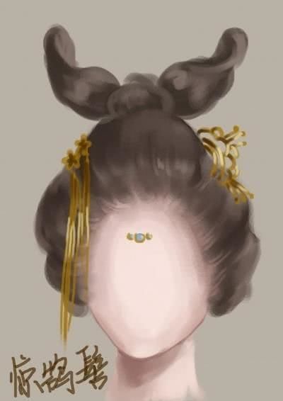 这种发式的编盘方法是:先将头发盘成一个十字行的发髻,再将余发在头的两侧各盘一鬟直垂至肩,上用簪、钗固定即可。