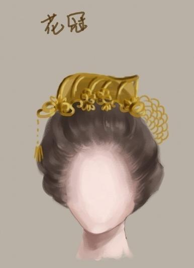 花冠:冠小仅束髻,冠上多有花饰,在明代仕女多好用。此图录自唐寅〈孟蜀宫妓图〉之花冠。